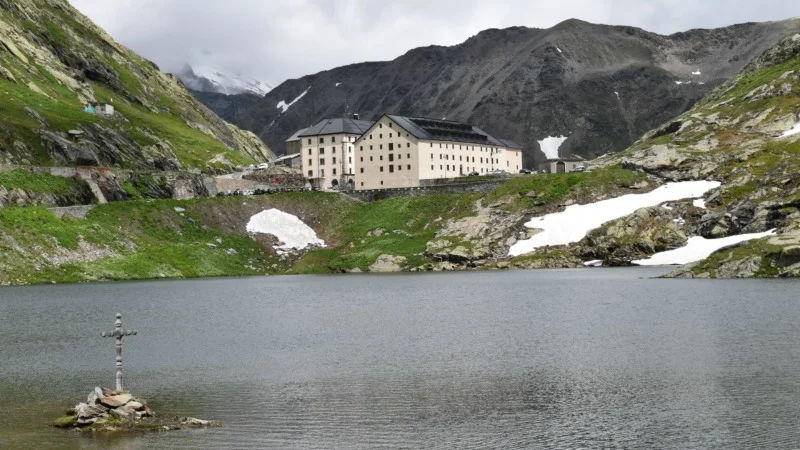 L'Hospice du Grand-Saint-Bernard se mire dans le lac qui s'étale à ses pieds (Photo: Jacques Berset)