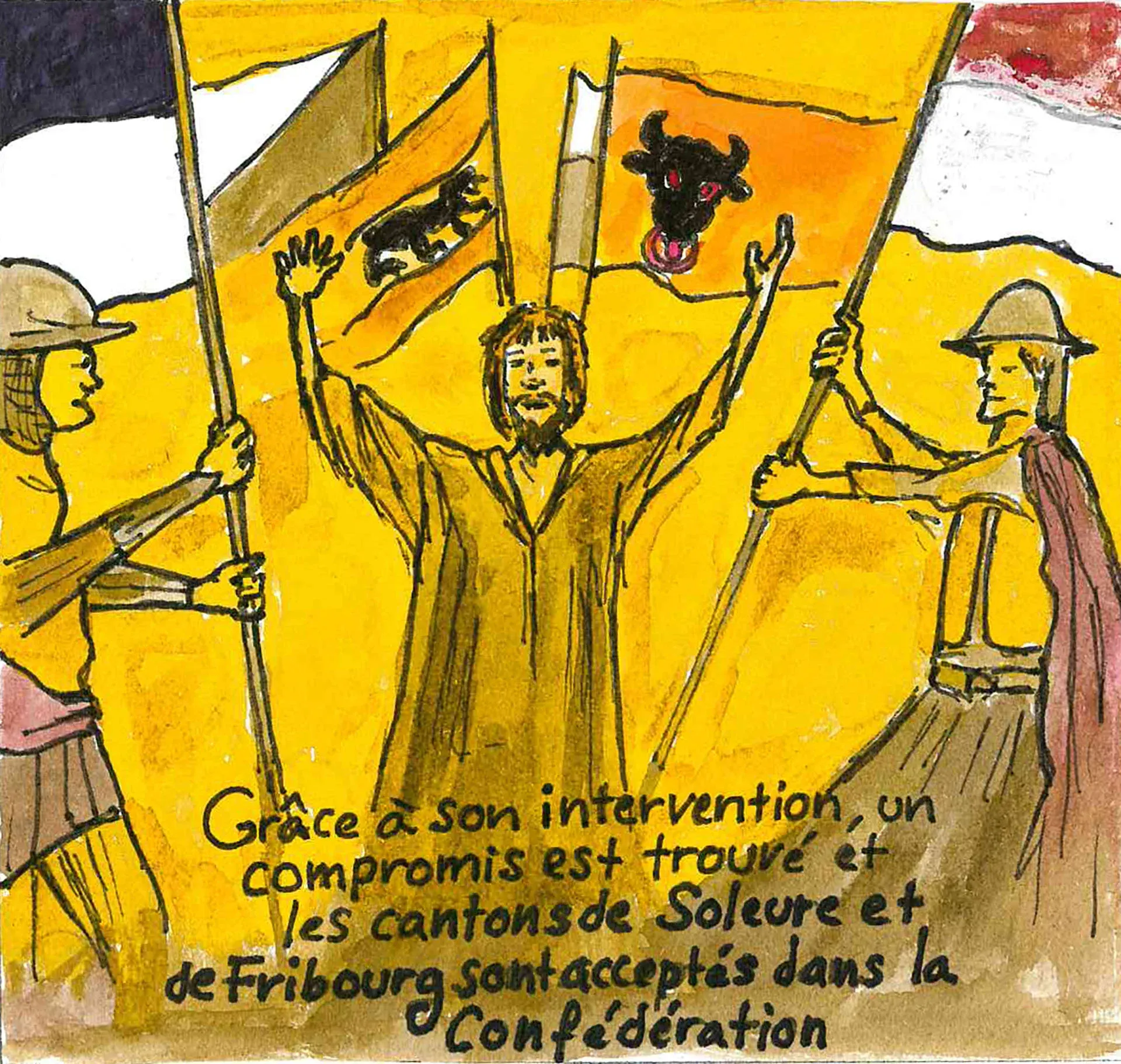 JR: Dans les conseils qu'il donne, Nicolas ne fait pas de théorie. Il écoute et pose des questions. Il insiste beaucoup sur l'obéissance, comprise d'abord comme l'écoute mutuelle. C'est un homme sage, un 'starets' des Alpes pour emprunter ce terme à l'Eglise orthodoxe. Il a des paroles très courtes, mais qui frappent au bon endroit.BS: Lors du convenant de Stans, à fin 1481, ce n'est probablement pas tant ce qu'il a fait dire, mais le fait que c'est lui qui l'ait dit qui importe le plus. Il était alors déjà considéré comme un saint homme dont il fallait écouter les conseils avisés.De fait, Nicolas vit dans une époque troublée et turbulente, un peu comme la nôtre.