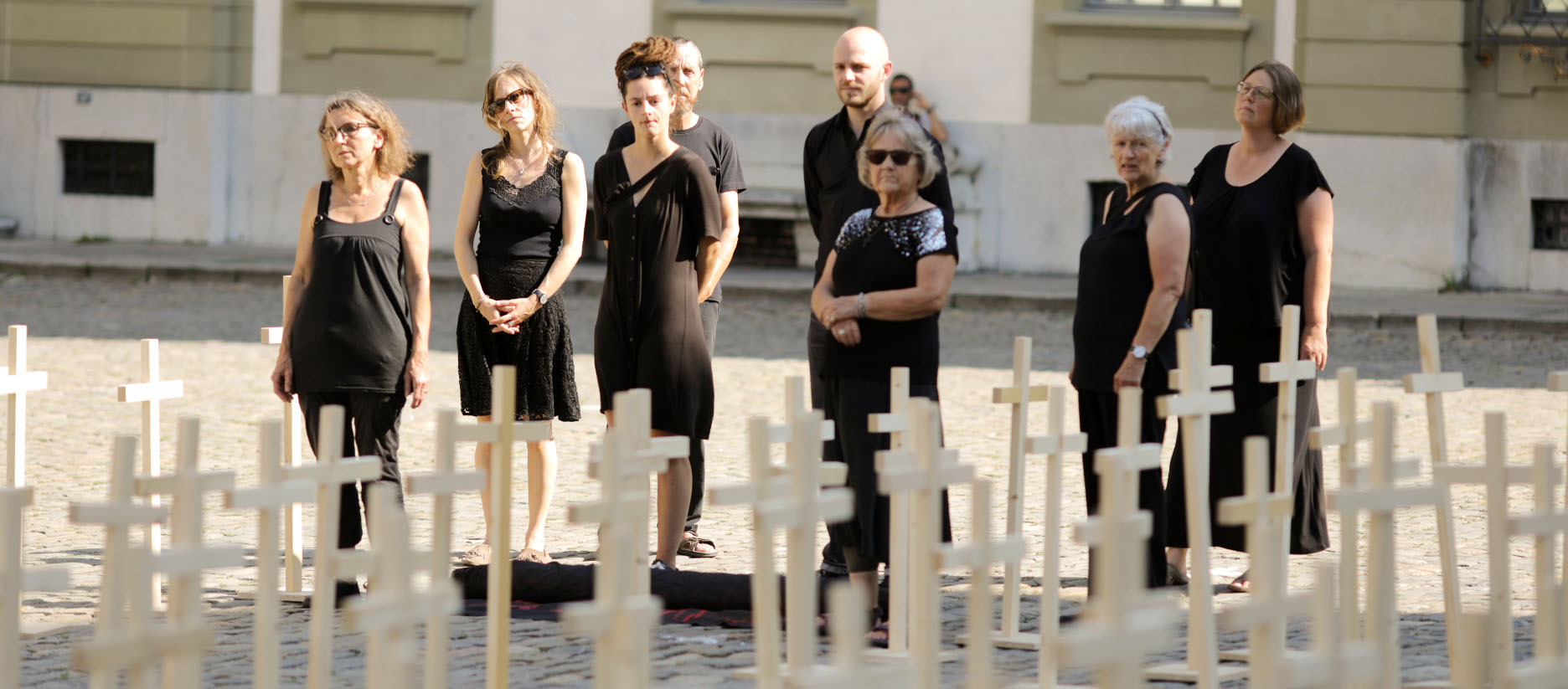 En raison de la pandémie de covid-19, l’action sur la Münsterplatz de Berne s’est déroulée sans public. Pour commémorer les victimes de persécutions, les militants, vêtus de noir, ont dressé des croix en bois et déposé des roses à leurs pieds.