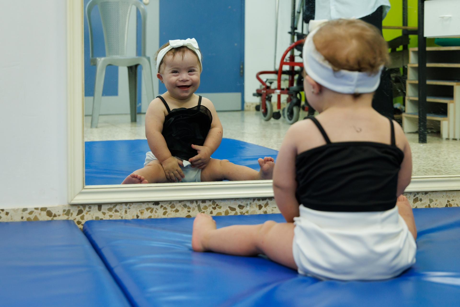 Karmel est porteuse de trisomie 21, un défaut génétique que l’on appelle aussi syndrome de Down. Il s’accompagne presque toujours d’un retard de développement physique et mental, qui peut être nettement amélioré par une rééducation précoce. La physiothérapie, par exemple : plus les muscles sont entraînés tôt, mieux c’est.