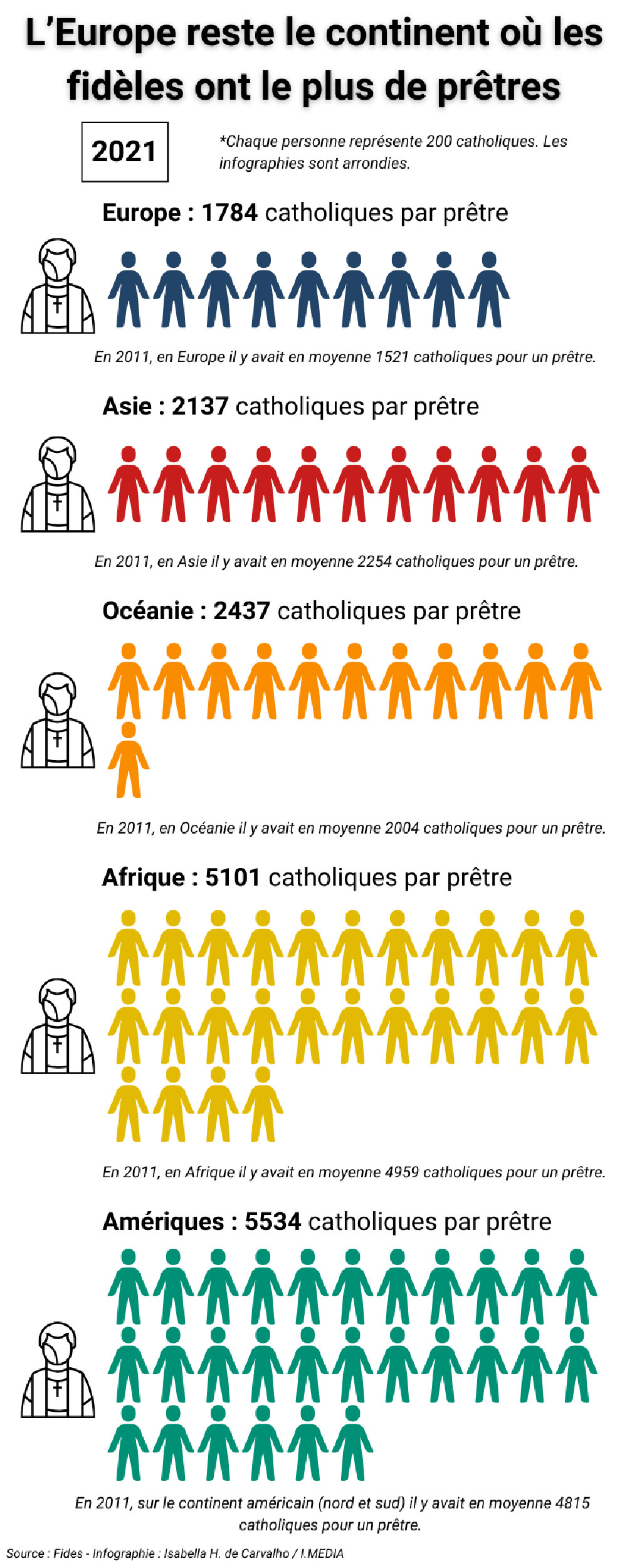 Sur les plus de 400’000 prêtres recensés au 31 décembre 2021, environ 40% restent Européens. Mais la proportion diminue puisqu’ils représentaient 45% du clergé mondial il y a dix ans.