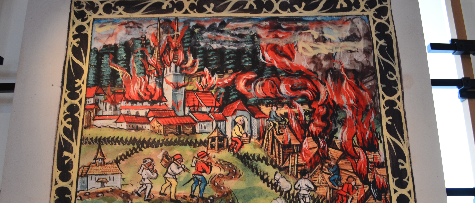 Une grande peinture moderne à la craie représentant une Vierge noire et une ancienne carte indiquant le monastère et le village invitent à parcourir cette exposition qui se tient dans une seule salle.