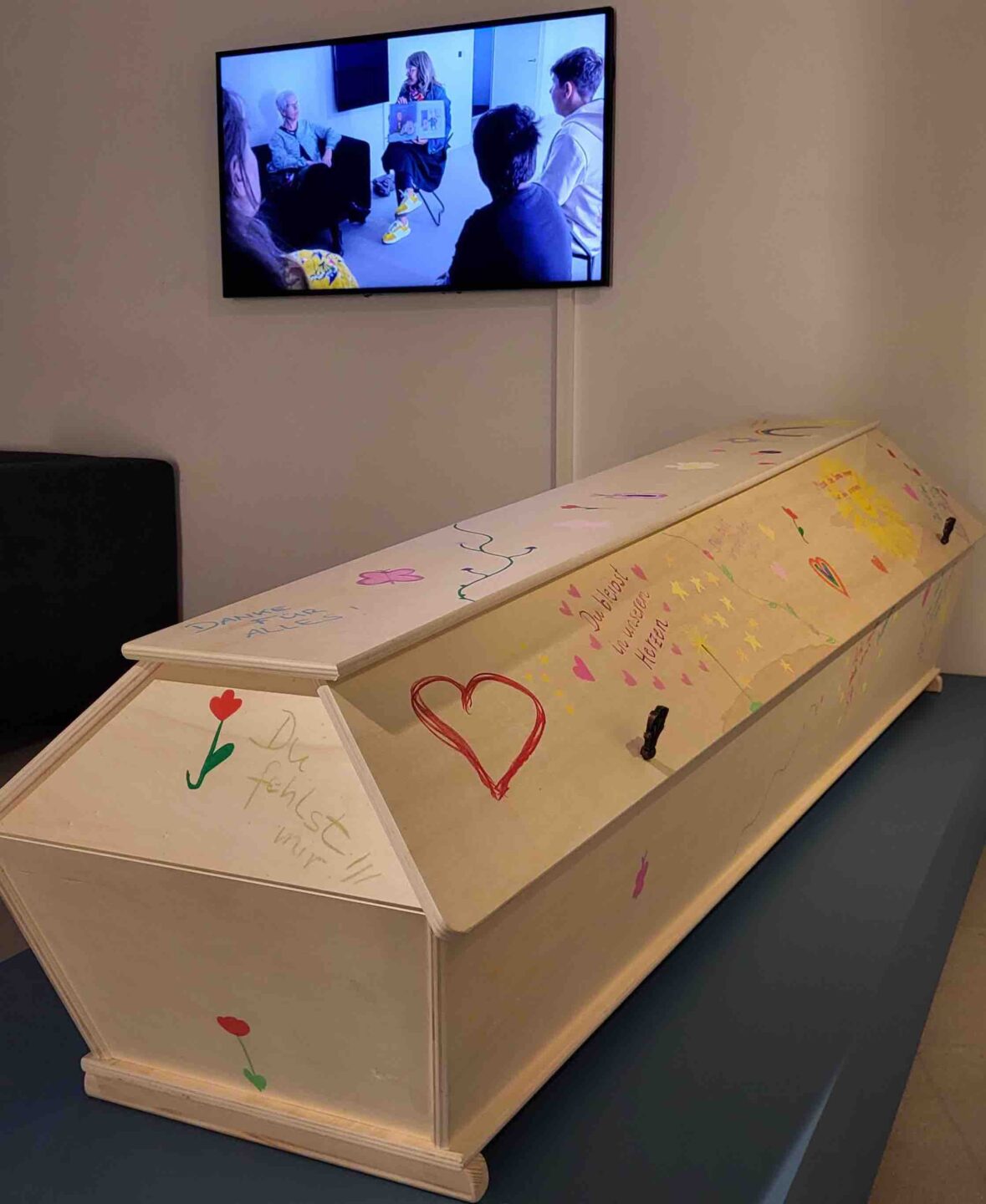 Sur le seuil du quatrième étage du Musée des cultures de Bâle (MKD) réservé à l’exposition Der Weg ins Jenseits (Le chemin vers l’au-delà), un cercueil en bois et une table de bistro attendent les visiteurs, comme une invitation à ne pas fuir la mort, mais à prendre un moment pour en parler. Des cœurs, des étoiles et des mots tendres laissés par des enfants parsèment les flancs du cercueil: «Du bleibst in unseren Herzen», «Auf wiedersen». «Tu restes dans nos coeurs. Au revoir…»