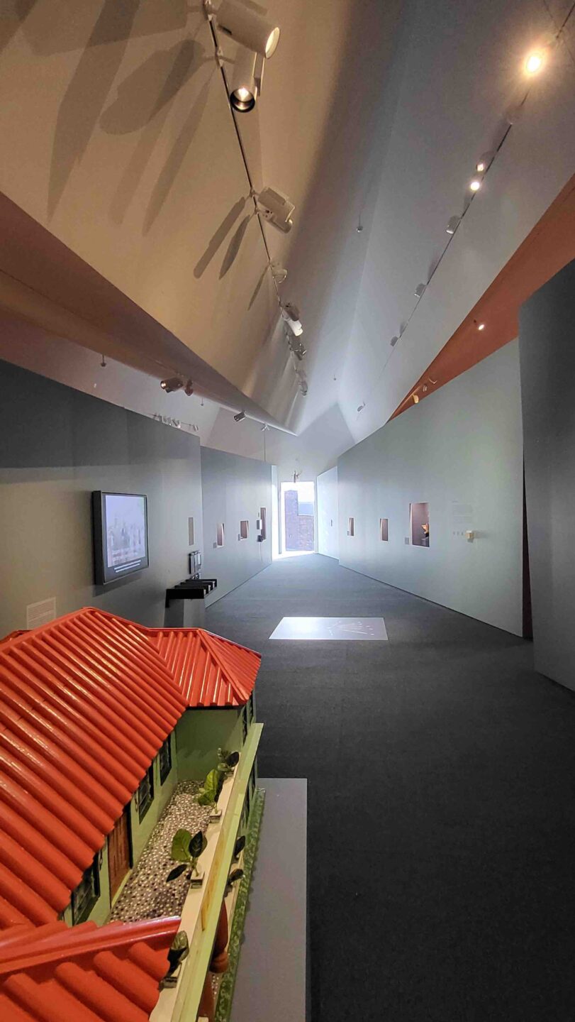 Là encore un cercueil attend le visiteur, en forme de maison des ancêtres cette fois, aux murs vert bouteille et au toit rouge vif. Il a été conçu par un Ghanéen, pour symboliser à la fois la fin du parcours terrestre du défunt et le début de sa nouvelle vie parmi ses ancêtres retrouvés. Sur une vidéo diffusée à côté sur un écran, une procession funéraire se déroule sur fond de danse et de chants rythmés. Dans ce pays majoritairement chrétien, la mort est doublement perçue comme un passage joyeux, car elle permet de rejoindre tout à la fois ses aïeux et Dieu.