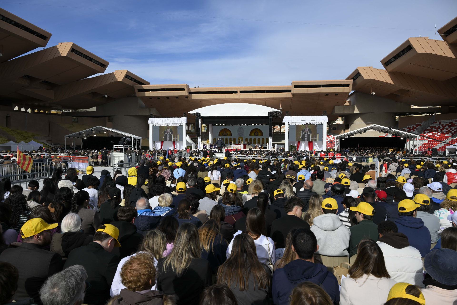 Après avoir déjeuné à l’archevêché de Monaco, le pape a rejoint le stade Louis II. Il a fait le tour du terrain en papamobile parmi les 15’000 fidèles qui l’attendaient depuis la mi-journée, avant de rejoindre la sacristie; pendant qu’il se préparait, la famille princière, installée sur l’estrade, priait le chapelet avec la foule.