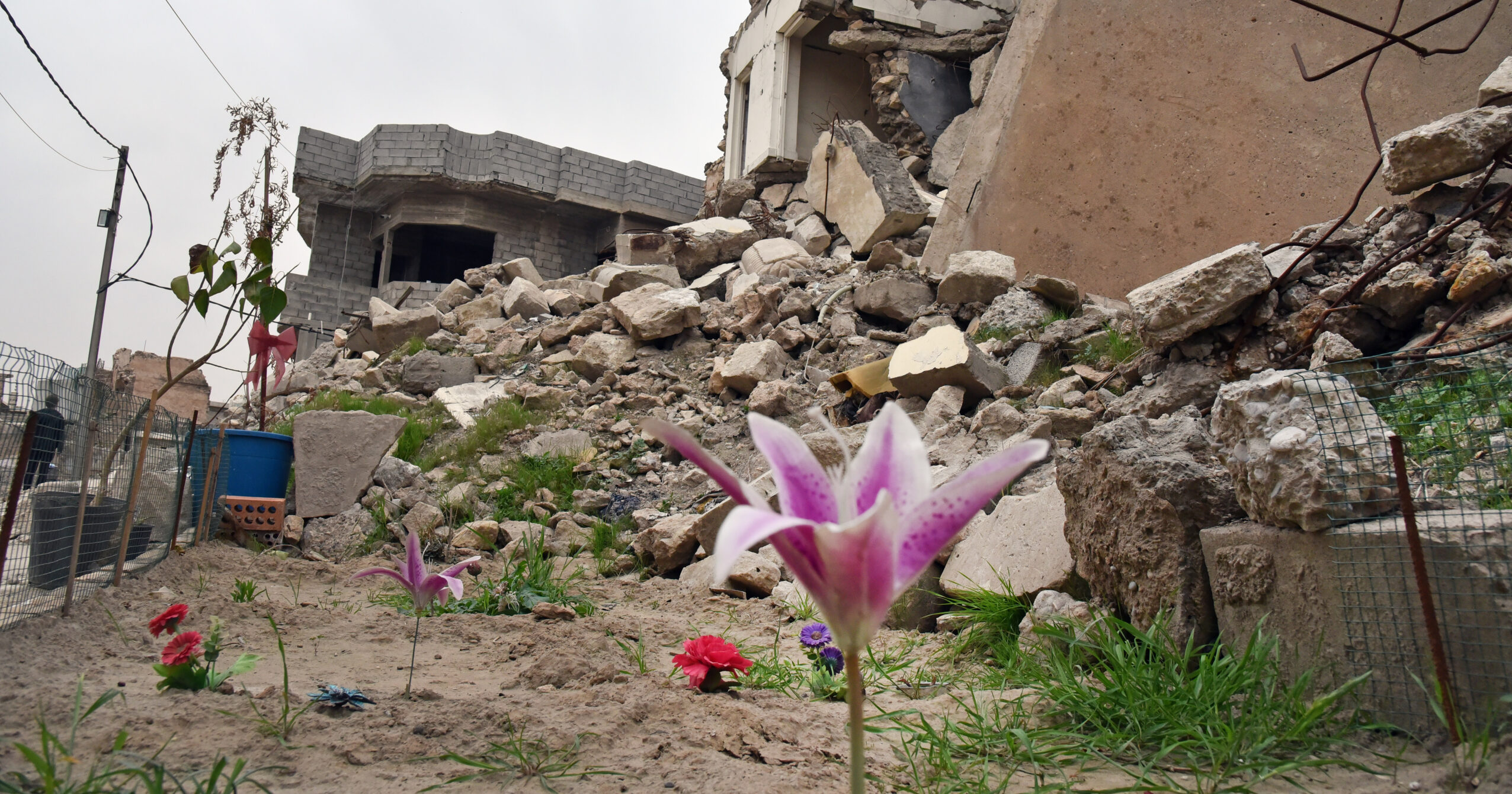 Un jardin de fleurs artificielles dans les ruines du "Vatican de Mossoul", un complexe abritant la cathédrale, 2022 | © Raphaël Zbinden