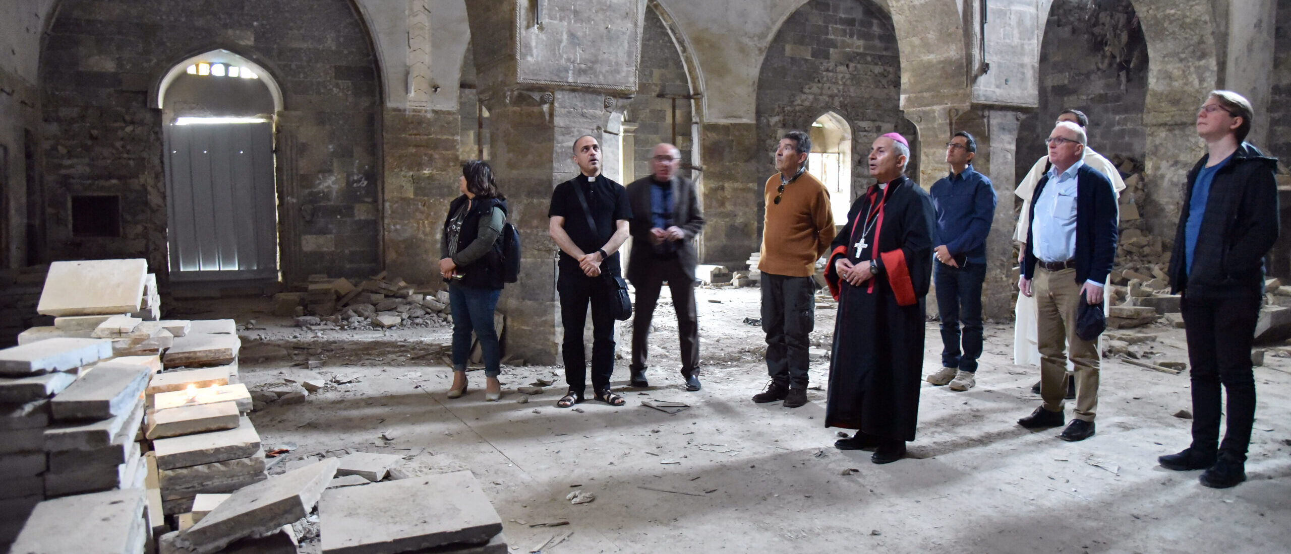 L’archevêque de Mossoul emmène ensuite le groupe vers la tribune où le pape François a prononcé un discours, le 7 mars 2021. Le pontife y avait versé des larmes en contemplant les outrages commis contre ces si anciens et vénérables bâtiments. La tribune, restée en place, avait symboliquement été placée à l’endroit-même où les sbires de l’État islamique (EI) fouettaient les musulmans de Mossoul qui n’adhéraient pas totalement à leurs idées.