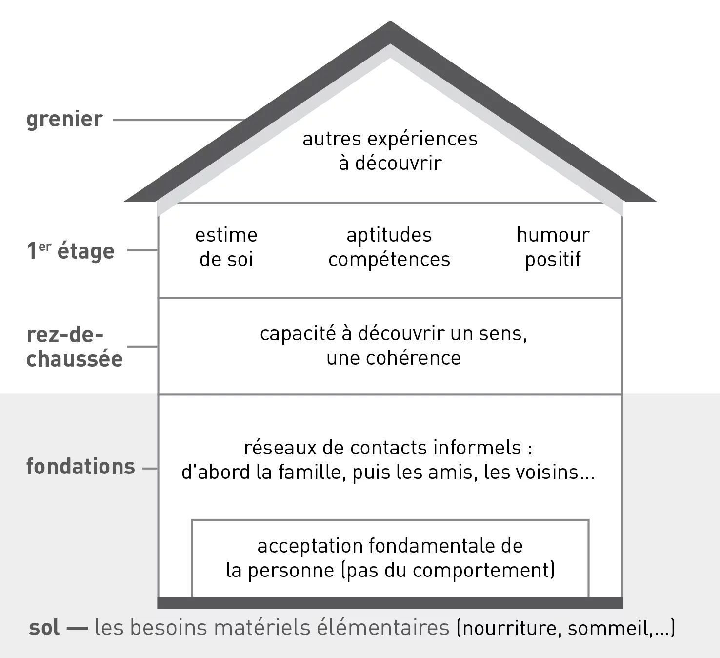 Le sol représente la satisfaction des besoins fondamentaux (logement, nourriture, vêtements). Les fondations, le sentiment d’être accepté par les autres tel que nous sommes et les réseaux de soutien. Le rez-de-chaussée est la capacité à donner un sens aux événements qui se produisent. Le premier étage laisse la place à l’estime de soi, au sens de l’humour et à d’autres compétences. Enfin, le grenier est l’espace pour les objectifs que nous nous fixons pour l’avenir. Ce modèle prend en compte les aspects individuels et environnementaux. Et il peut être utilisé dans divers contextes (éducatif, psychologique, clinique) avec les enfants, les adolescents, mais aussi avec les adultes. MP