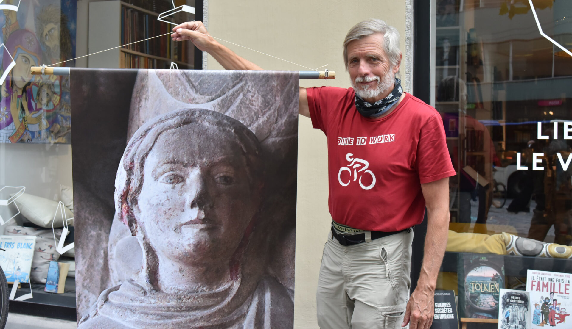 «Ici nous avons une statue de la Vierge de la cathédrale de Chartres qui a servi d’archétype», explique René Bugnion à cath.ch. Le passionné d’architecture et de patrimoine égrène son classeur tel un rosaire dans la Librairie du Valentin, à Lausanne, dont il est un habitué. La fascination du retraité pour l’art sacré est perceptible alors qu’il tourne les pages où sont regroupés les éléments du «Projet de restauration de la Vierge à l’Enfant du narthex de la cathédrale de Lausanne«, dont il est la cheville ouvrière.