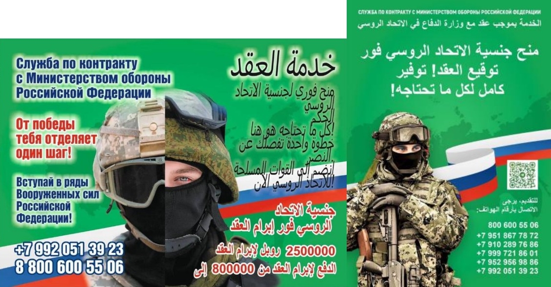 L’armée ukrainienne a publié en mai 2024 des photos de prospectus destinés au recrutement de combattants qui auraient été distribués dans des pays africains anglophones. Ces publications célèbrent les volontaires venus renforcer l’armée russe, servant ainsi de caisse de résonance sur une opportunité unique de changer de vie. Les promesses des recruteurs sont alléchantes: un paiement initial en espèces entre 2’000 USD et 30’000 USD pour la signature d’un contrat, puis un salaire mensuel autour de 2’500 USD, avec une assurance maladie incluse, une naturalisation russe accélérée pour chaque candidat au bout de 3 à 6 mois de service, une formation militaire d’élite.