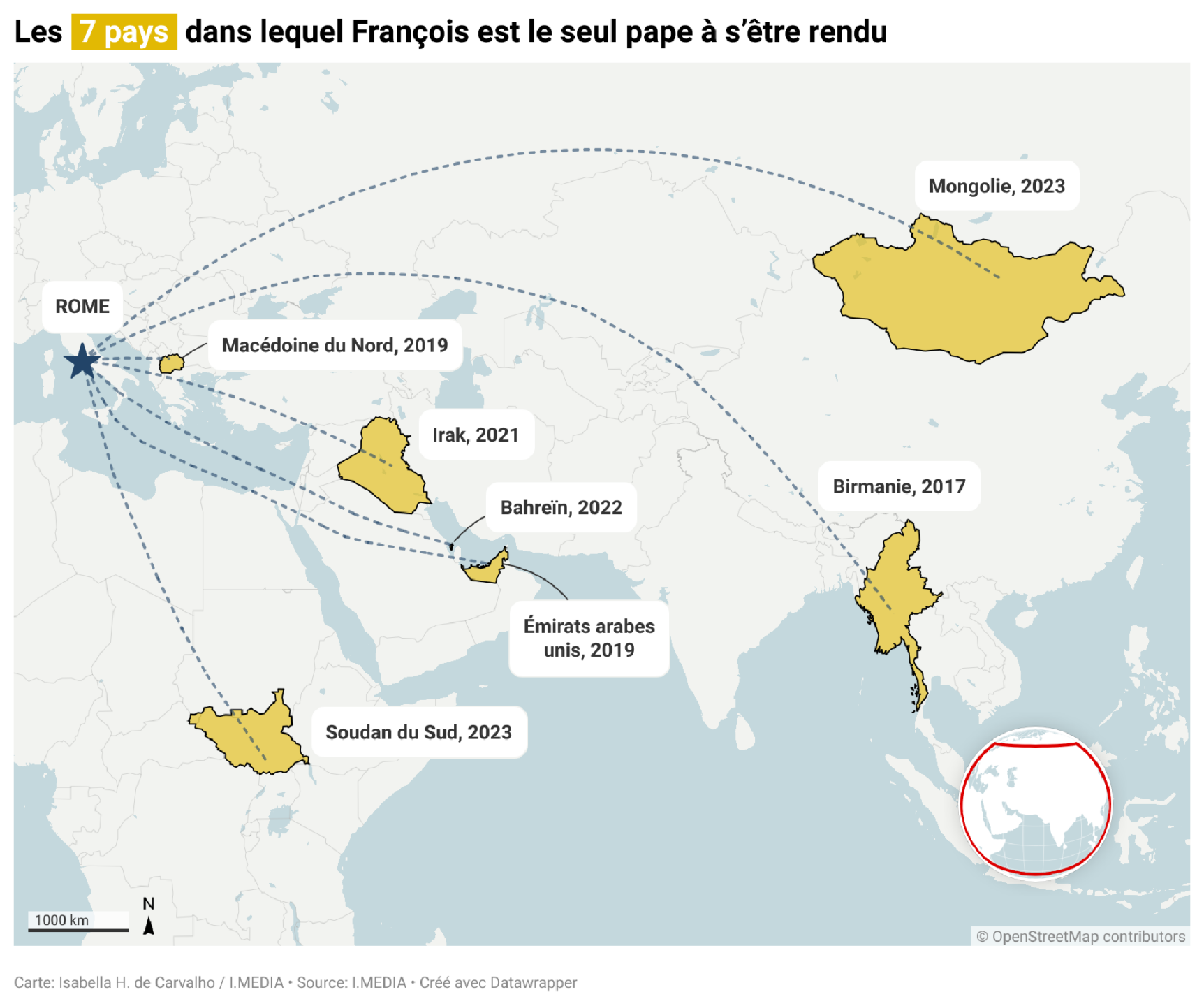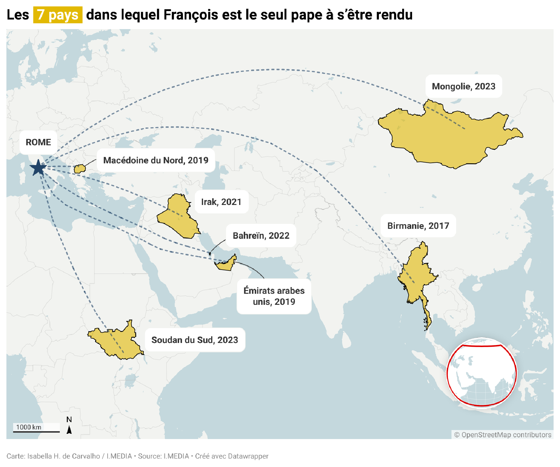 Avec ce nouveau voyage, le pape visitera quatre pays dans lesquels il ne s’est jamais rendu, dont trois asiatiques. Et en mettant pied à terre en Papouasie-Nouvelle-Guinée, il se rendra pour la première fois en Océanie et aura dès lors visité tous les continents.
