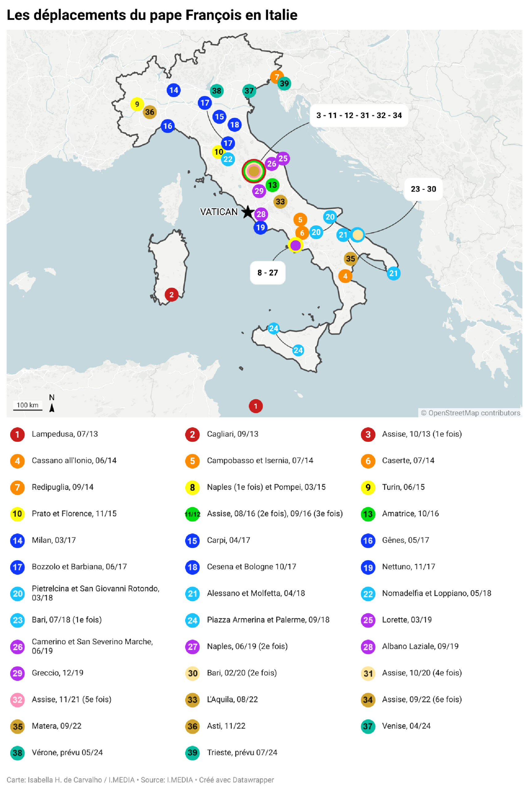 Le pape a effectué plus d’une trentaine de déplacements dans la Péninsule, accordant à certaines villes plusieurs voyages. Il s’était ainsi rendu à six reprises à Assise, la ville de saint François, le Poverello, dont il avait pris le nom le jour de son élection comme successeur de Pierre.
