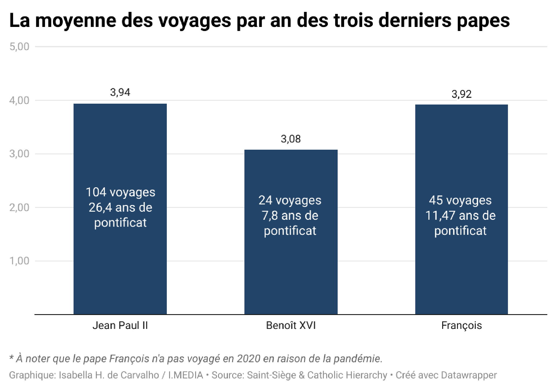 Cette moyenne le place aux côtés de Jean Paul II, qui, en un peu plus de 26 ans de pontificat, avait effectué 104 visites pastorales à l’étranger, soit près de quatre par an également – il avait été notamment empêché de voyager entre février 1981 et février 1982 après la tentative d’assassinat dont il a été victime le 13 mai 1981.