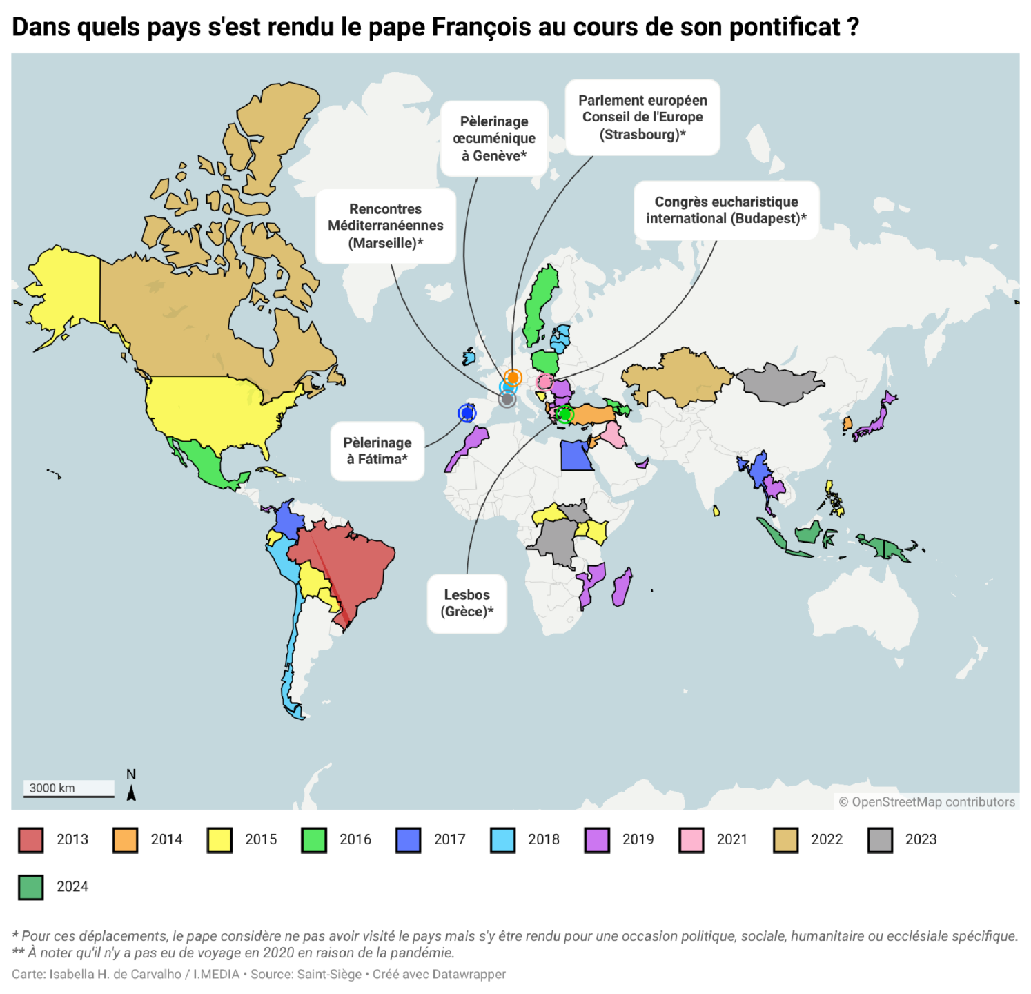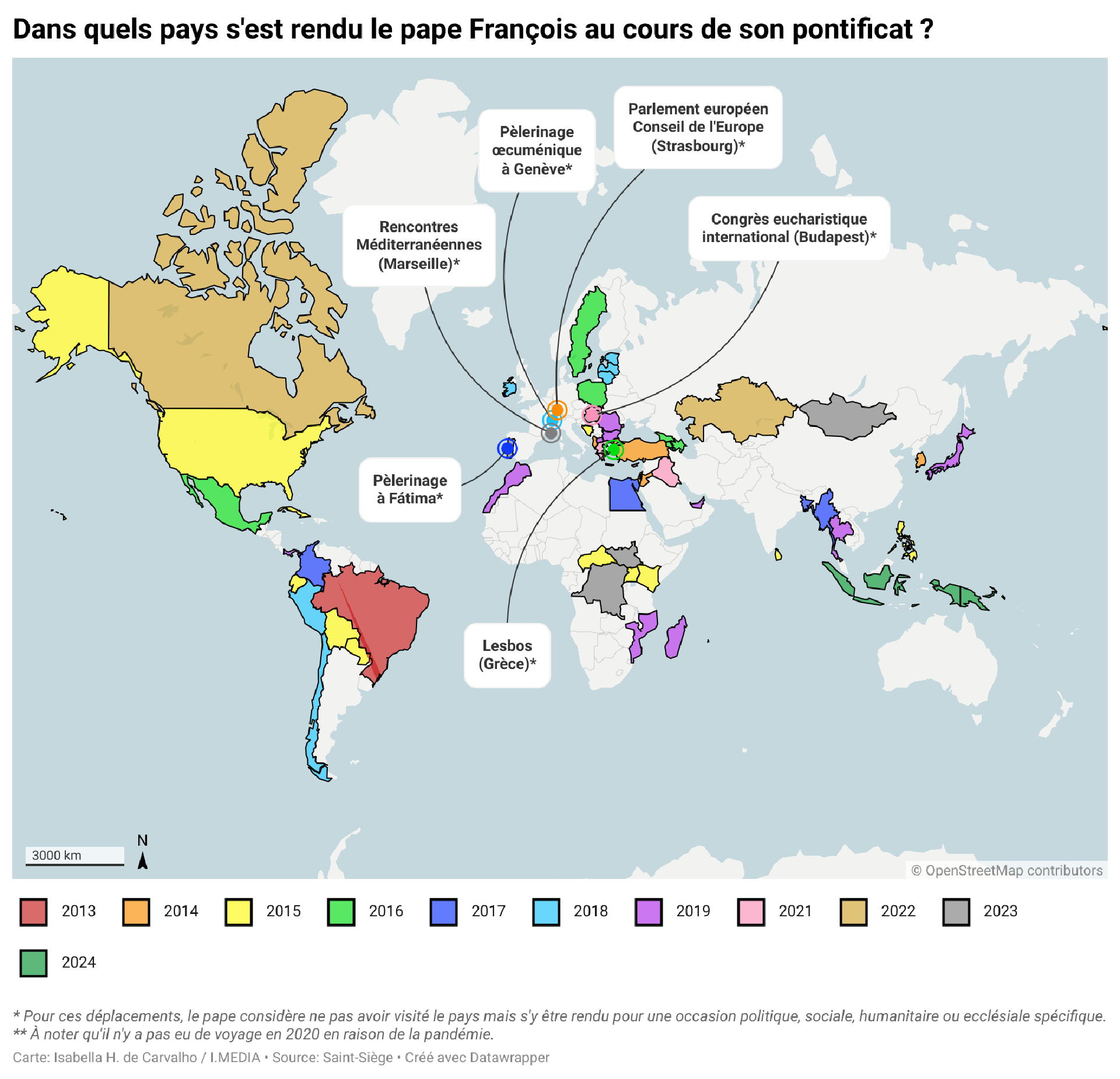 En moyenne, François a effectué un peu moins de quatre déplacements à l’étranger par an. Une statistique à nuancer puisqu’il n’a pas pu voyager en 2020 en raison de la pandémie de Covid-19. Par ailleurs, il n’a effectué qu’un seul voyage en 2013 – les Journées mondiales de la Jeunesse à Rio de Janeiro, au Brésil – et un seul en 2024 pour le moment.