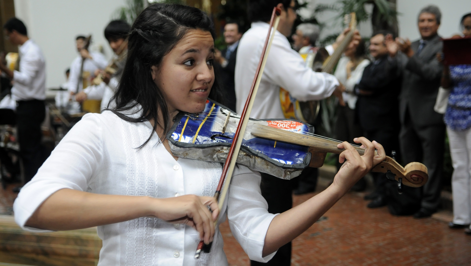 A son arrivée dans le Palais des sports pouvant accueillir jusqu’à 5’000 personnes, le pape François a d’abord écouté un concert de l’orchestre de Cateura, un quartier pauvre d’Asunción, désormais connu dans le monde entier pour ses instruments, fabriqués à partir de déchets récupérés dans les ordures, gouttières, pièces de monnaie, boîtes de conserve etc. Après avoir écouté les questions d’un jeune catholique, d’un indigène, d’une paysanne, d’une entrepreneuse et d’un fonctionnaire, le pape leur a répondu dans un discours, quittant souvent son texte des yeux pour improviser, et méditer, notamment, sur le concept d’idéologies.