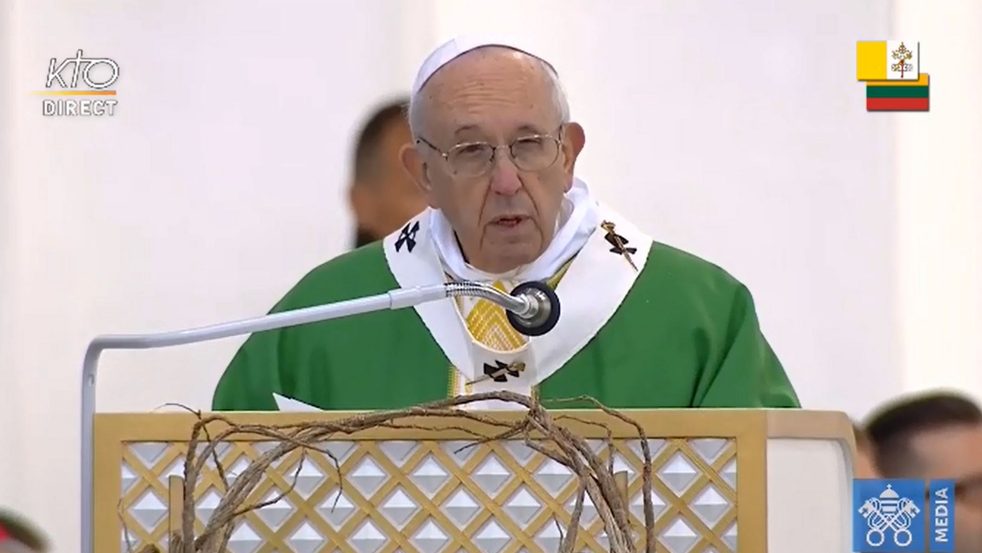 Au deuxième jour de sa visite dans les pays baltes, le pontife s’est dirigé vers Kaunas, seconde ville lituanienne. Il y a célébré une messe dans le parc Santakos, comme Jean Paul II en septembre 1993. Malgré une chute de la température, plus de 100’000 personnes étaient présentes, agitant des drapeaux du Vatican et de la Lituanie. Des bannières de Pologne et même d’Israël étaient également visibles dans la foule.