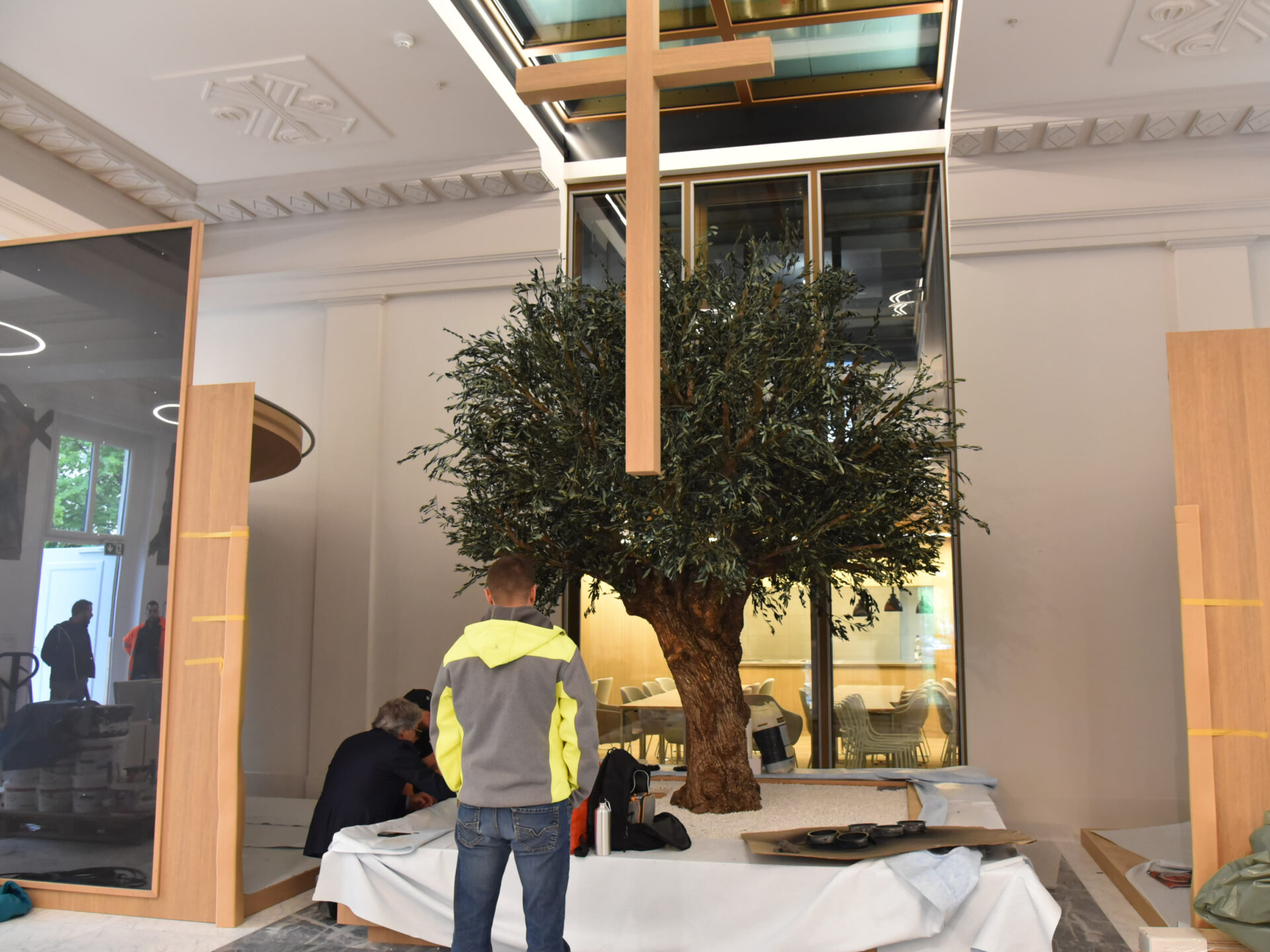 L’espace dédié à l’église est le même qu’avant l’incendie. Il a été toutefois entièrement redessiné et repensé pour répondre aux réalités liturgique de Vatican II, souligne Silvana Bassetti. Tout cela selon un concept élaboré par l’architecte français Jean-Marie Duthilleul, spécialiste du réaménagement et de la modernisation des églises. Le nouvel espace sacré s’organise autour d’un axe sacramentel, avec l’orgue (en cours de réalisation), le baptistère, l’ambon, l’autel, le tabernacle, la présidence, la croix monumentale suspendue au plafond et un olivier. Il s’agit d’un arbre véritable, qui a été «stabilisé» selon une technique avancée de conservation de végétaux, eu égard au manque de lumière à l’intérieur de l’église.