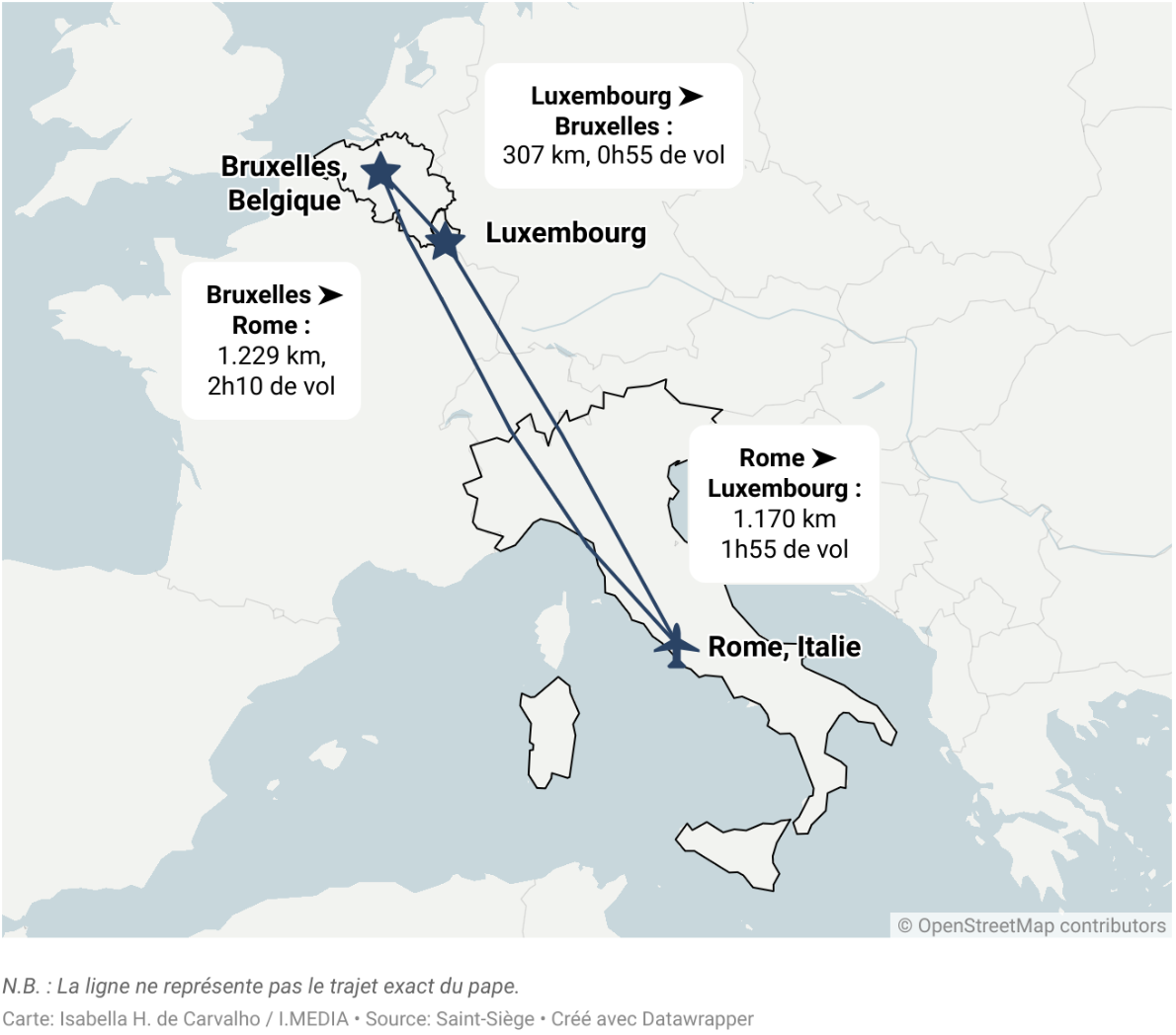 Le pape partira de l’aéroport de Rome Fiumicino à 08h05 à bord d’un avion de la compagnie ITA Airways. Le trajet d’un peu plus de 1.100 kilomètres s’effectuera en 01h55.