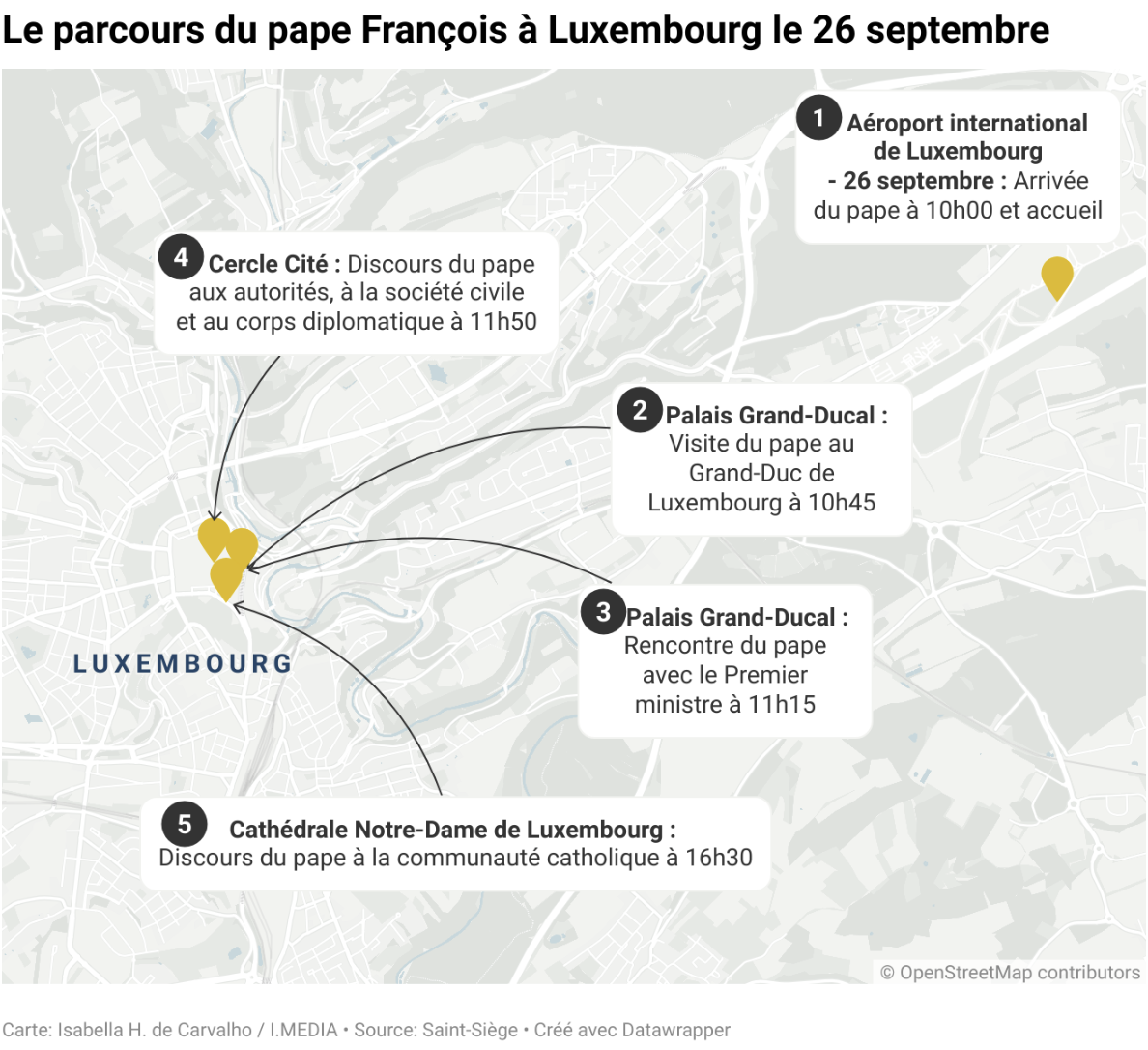 Le chef de l’Église catholique rencontrera ensuite le Premier ministre du pays, actuellement Luc Frieden, issu du Parti populaire chrétien-social (3). Puis il prononcera son premier discours (4) lors d’une rencontre à 11h50 avec les autorités, la société civile et le corps diplomatique au Centre Cité, un centre de congrès et d’expositions.