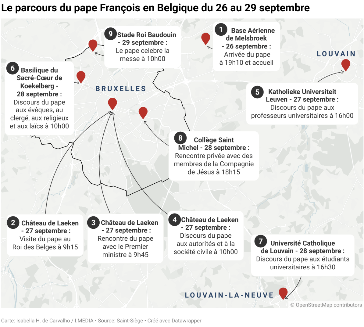 À son arrivée (1) sur le sol belge en début de soirée, le roi et la reine de Belgique seront présents pour l’accueillir, ainsi que les évêques belges, les recteurs de l’UCLouvain (l’université catholique francophone) et de la KU Leuven (néerlandophone) ainsi que d’autres personnalités du monde ecclésiastique et civil.