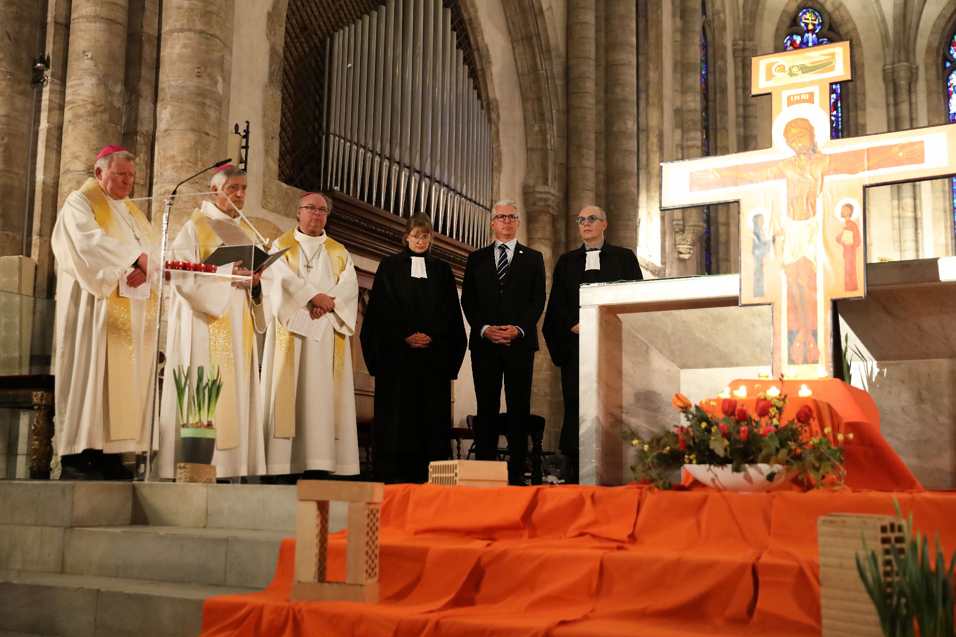 «Et de le vivre avec les protestants était un plus. Nous étions ainsi tous unis dans la prière». Accompagné de Mgr Josef Stubi, évêque auxiliaire de Bâle, et de l’abbé de Saint-Maurice, Alexandre Ineichen, Jean-Marie Lovey a accueilli dans le chœur de la cathédrale Sara Schulthess, pasteure de la paroisse protestante de Sion, et Gilles Cavin, président du synode de l’Eglise évangélique réformée de Suisse ainsi que le président du Conseil synodal Stephan Kronbichler.