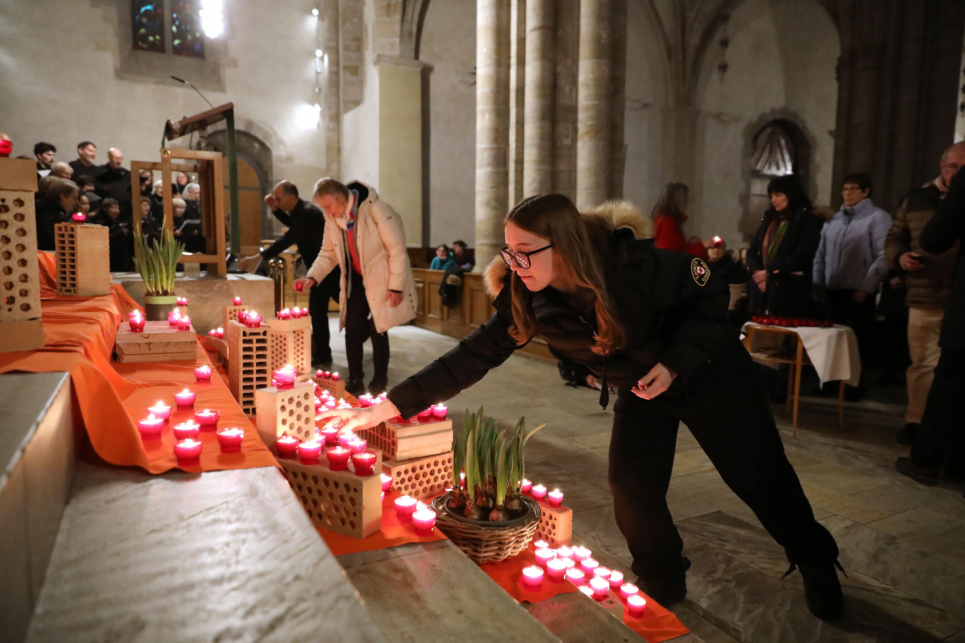 La célébration s’est ouverte par un geste symbolique des célébrants présents dans le chœur de la cathédrale: chacun est venu allumer un lumignon et l’a déposé au pied de l’autel. Ces petites lumières ont été l’autre symbole marquant de cette célébration.