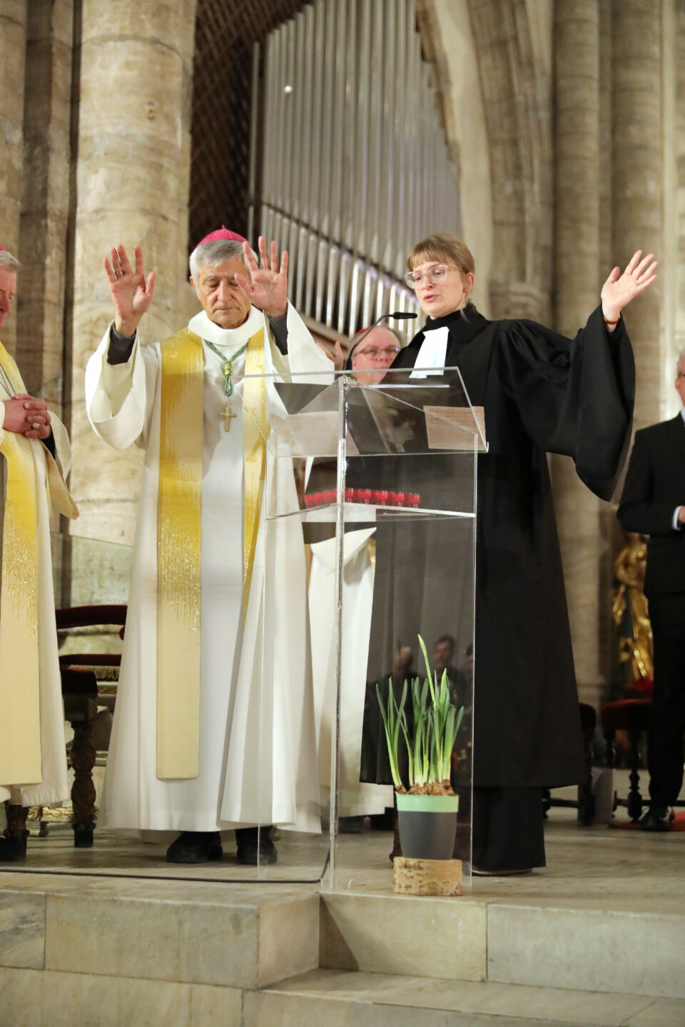 «Au nom de l’Eglise évangélique réformée (EREV), je souhaite également vous saluer, tout en exprimant ma gratitude de pouvoir vivre ce moment en commun, dans la prière, dans les larmes, dans l’espoir», a répondu en écho Sara Schulthess qui s’est également exprimée en Allemand.