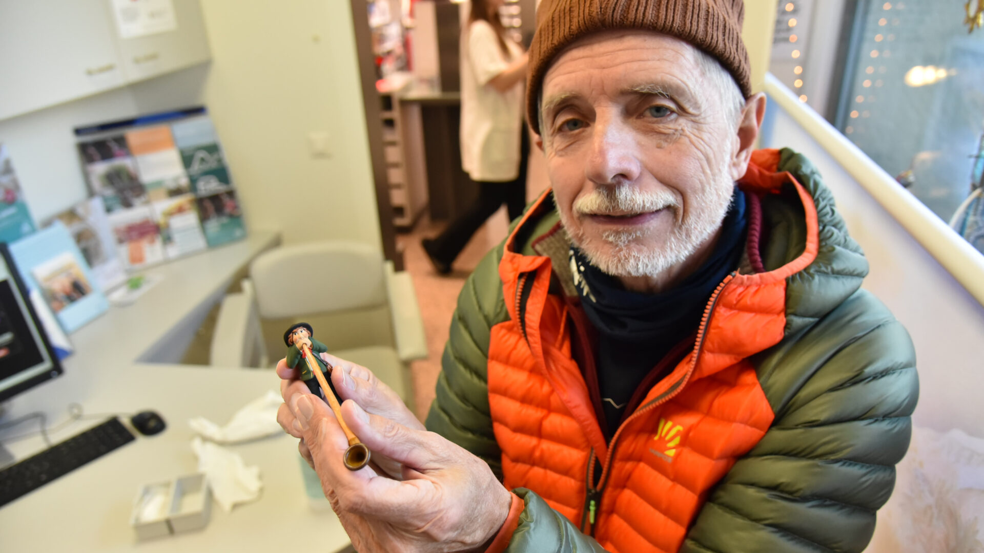 René Bugnion entre sans autre dans la pharmacie en saluant à nouveau les employés sur son passage. Il profite d’être sur place pour déposer de nouveaux santons, dont un joueur de cor des alpes.