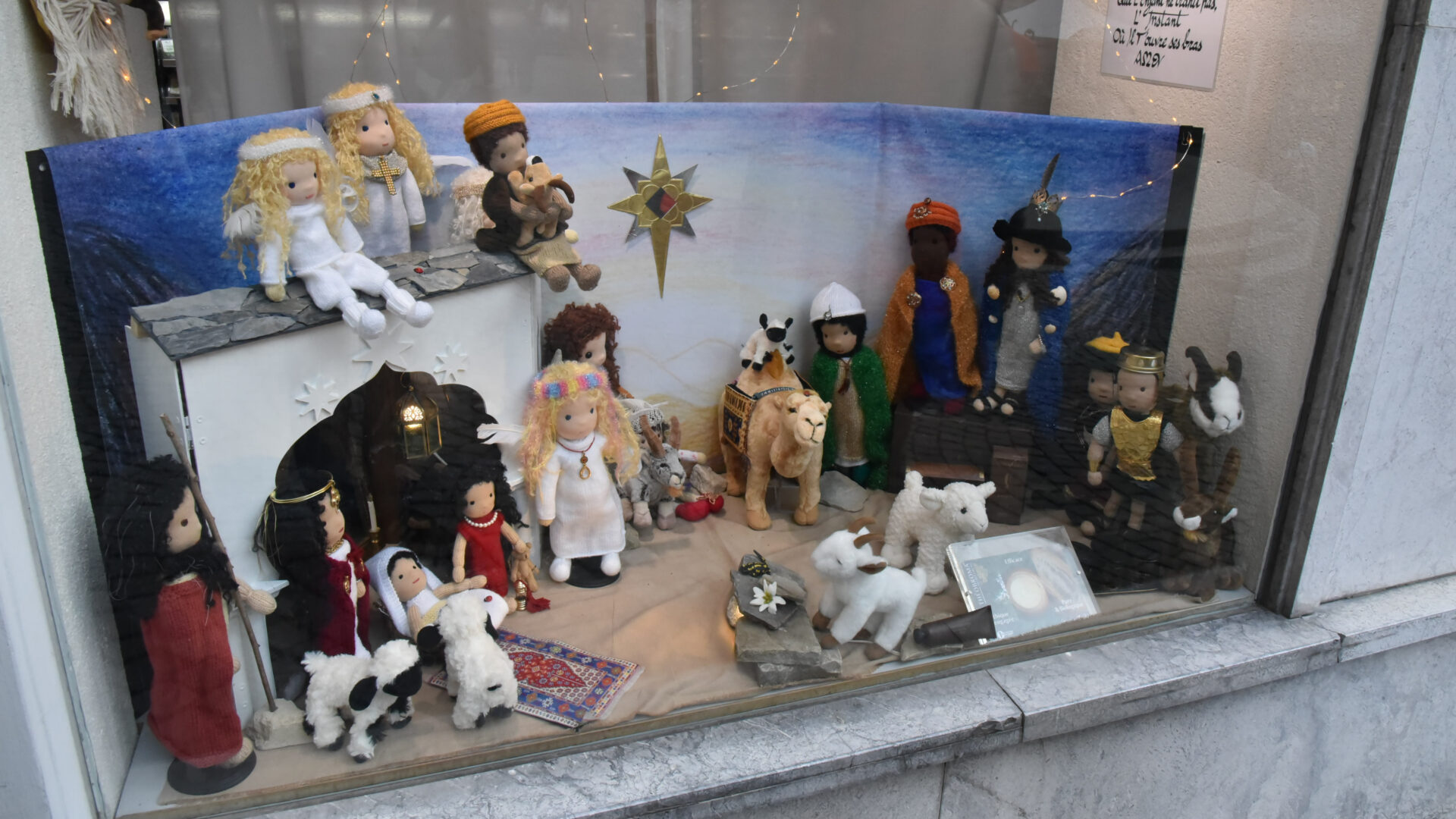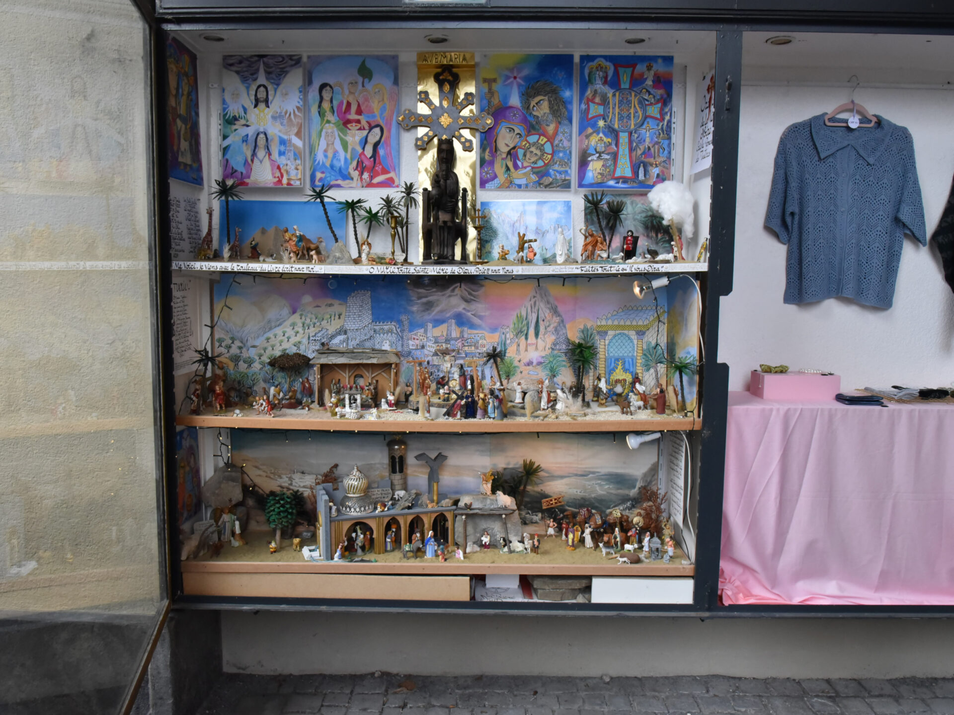 C’est le cas de la dernière installation du pèlerinage, qui se situe à côté de la librairie Le Valentin, au-dessous de la basilique Notre-Dame. Dans une grande vitrine murale, la crèche, qui se décline sur plusieurs étages, est la seule permanente de l’itinéraire. Elle contient, comme les autres, des images pieuses et des poèmes calligraphiés réalisés par René Bugnion. «La crèche, ce monde, celui du tout petit, de tout en bas. Cela est ici comme si tu te voyais de l’au-delà. Le réel a le secret. Que l’enfant ne trahit pas, l’instant où il t’ouvre ses bras. Amen», proclame l’un de ces textes.