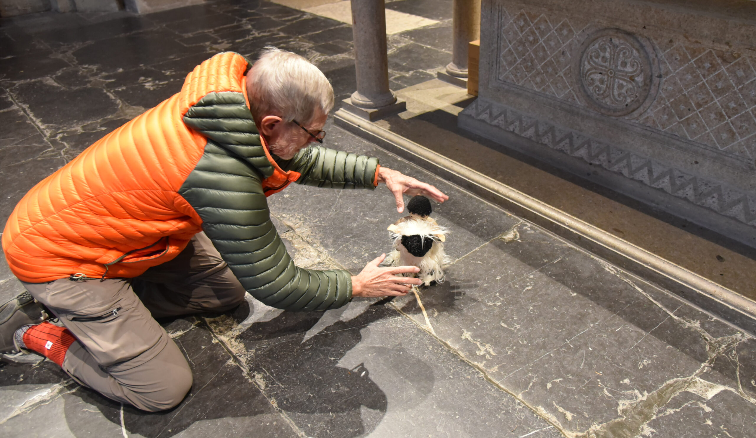 La prochaine étape est la cathédrale de Lausanne. L’édifice protestant a abrité, les années précédentes, une crèche de René Bugnion. Cela n’a cependant pas pu se faire cette année. Il tient toutefois à y ramener provisoirement la poupée Heidi et sa brebis noire et blanche «Erravi», qui étaient dans la crèche en 2024. Le Lausannois replace un moment l’héroïne suisse chevauchant fièrement sa monture devant le maître autel.