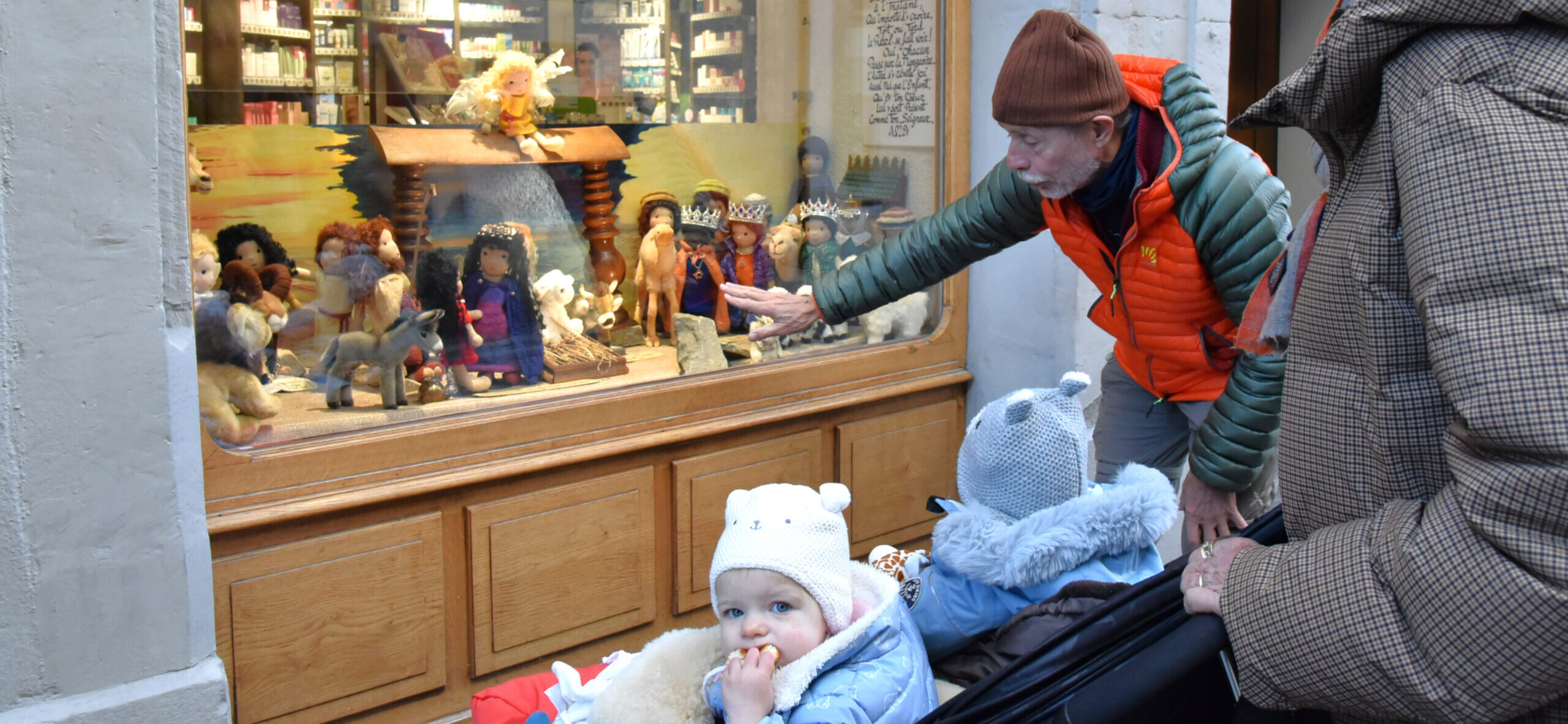 «Vous voyez, le petit Jésus n’est pas là, parce qu’Il est encore dans le ventre de sa maman!» René Bugnion explique aux jumeaux dans la poussette la crèche qu’il a installée dans la vitrine de la pharmacie BENU, à Lutry.