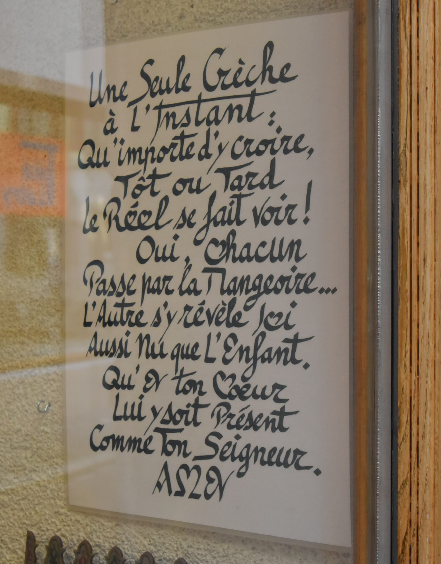 C’est le cas de la dernière installation du pèlerinage, qui se situe à côté de la librairie Le Valentin, au-dessous de la basilique Notre-Dame. Dans une grande vitrine murale, la crèche, qui se décline sur plusieurs étages, est la seule permanente de l’itinéraire. Elle contient, comme les autres, des images pieuses et des poèmes calligraphiés réalisés par René Bugnion. «La crèche, ce monde, celui du tout petit, de tout en bas. Cela est ici comme si tu te voyais de l’au-delà. Le réel a le secret. Que l’enfant ne trahit pas, l’instant où il t’ouvre ses bras. Amen», proclame l’un de ces textes.