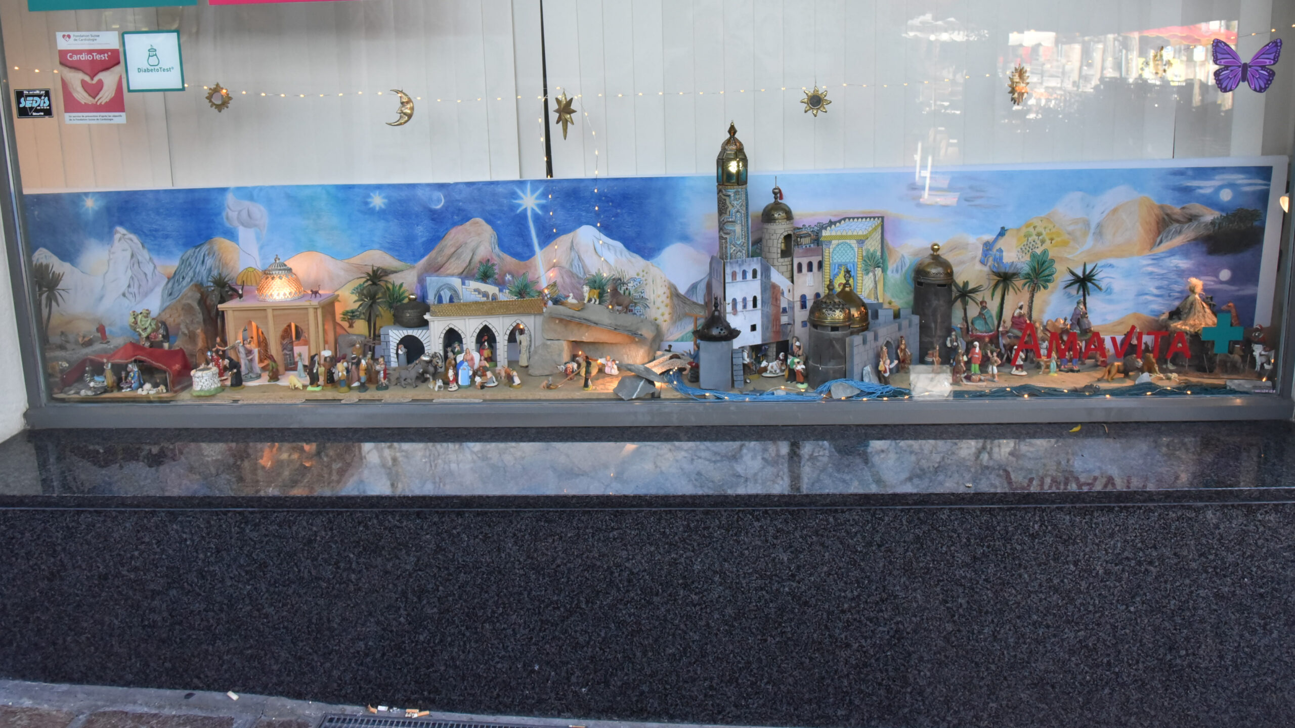 Un peu plus haut, à la Place de la Gare, la pharmacie AMAVITA abrite dans sa vitrine la plus grande structure du parcours, la «crèche universelle», eu égard aux multiples thèmes qu’elle présente. De nombreux personnages parsèment le plateau de plusieurs mètres de long. Avec des figures que l’on ne trouve pas forcément dans la Bible, tels que le professeur Tournesol ou Charlot.