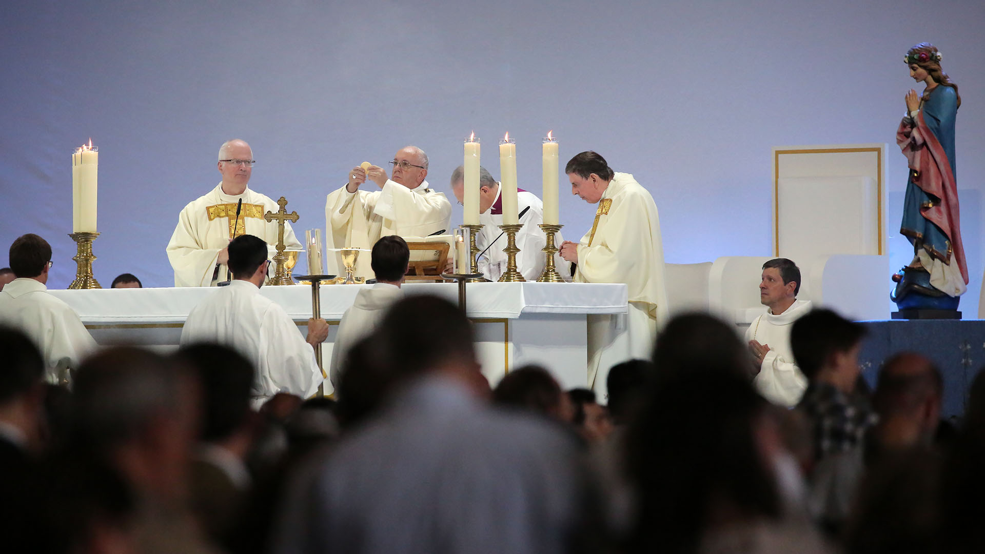 Le pape, entouré de Mgr Morerod (g.) et du cardinal suisse Kurt Koch| © Bernard Hallet